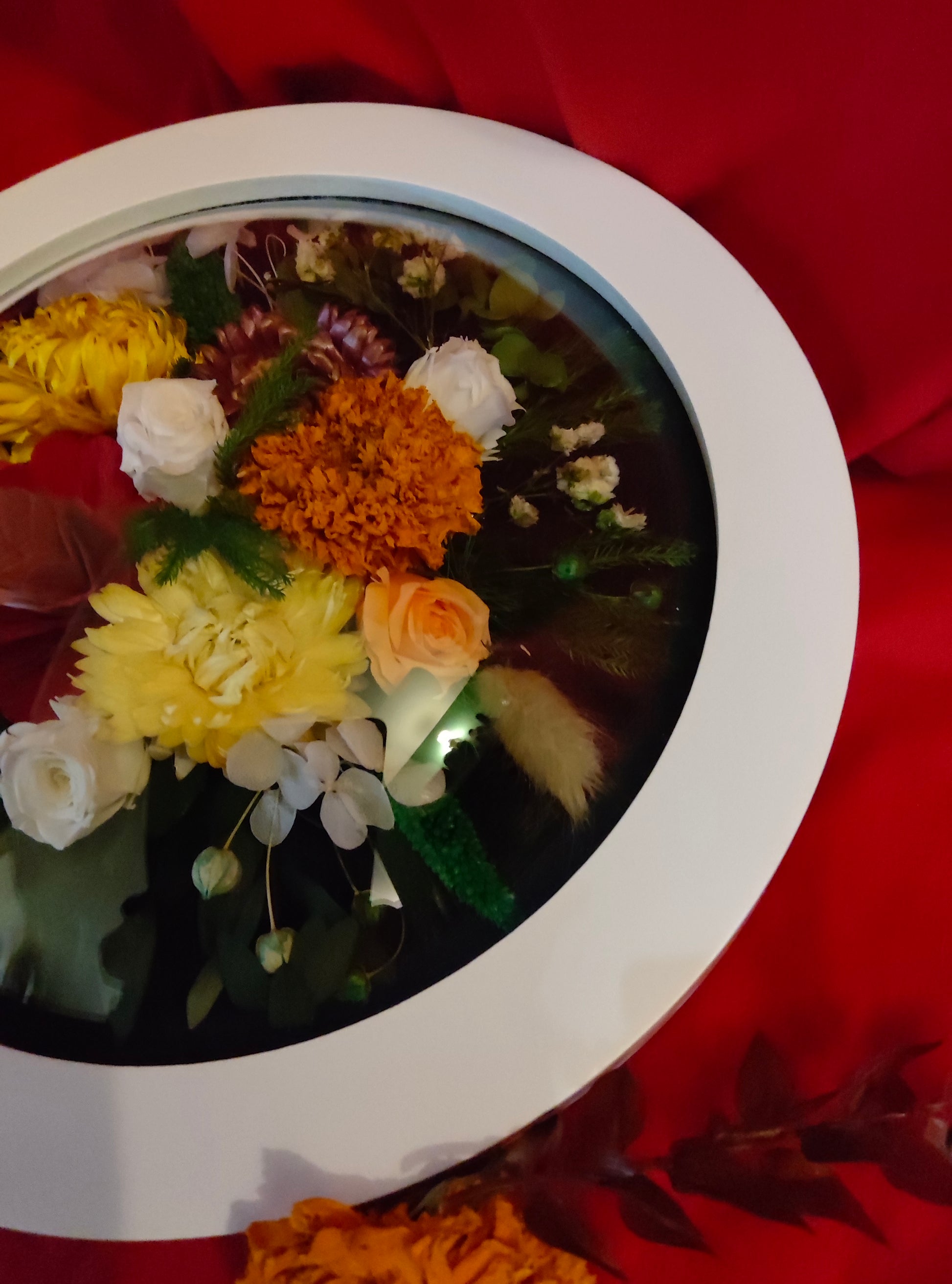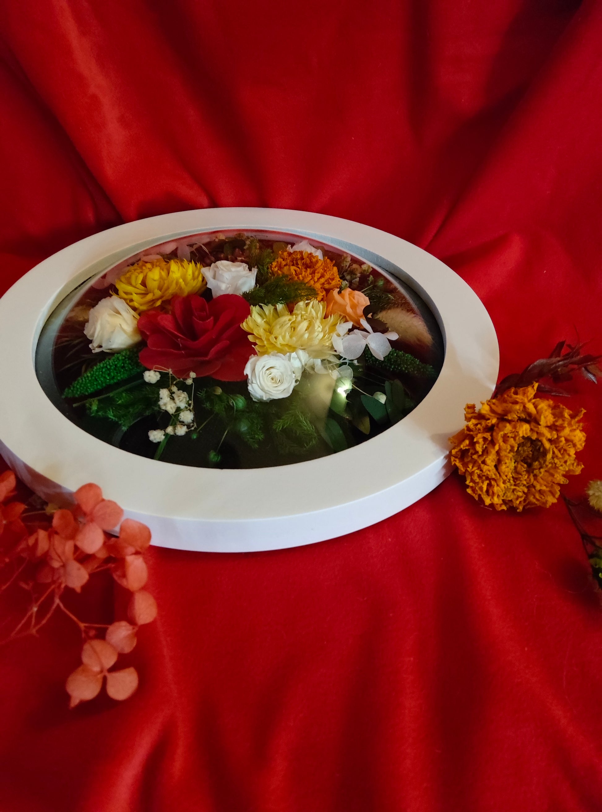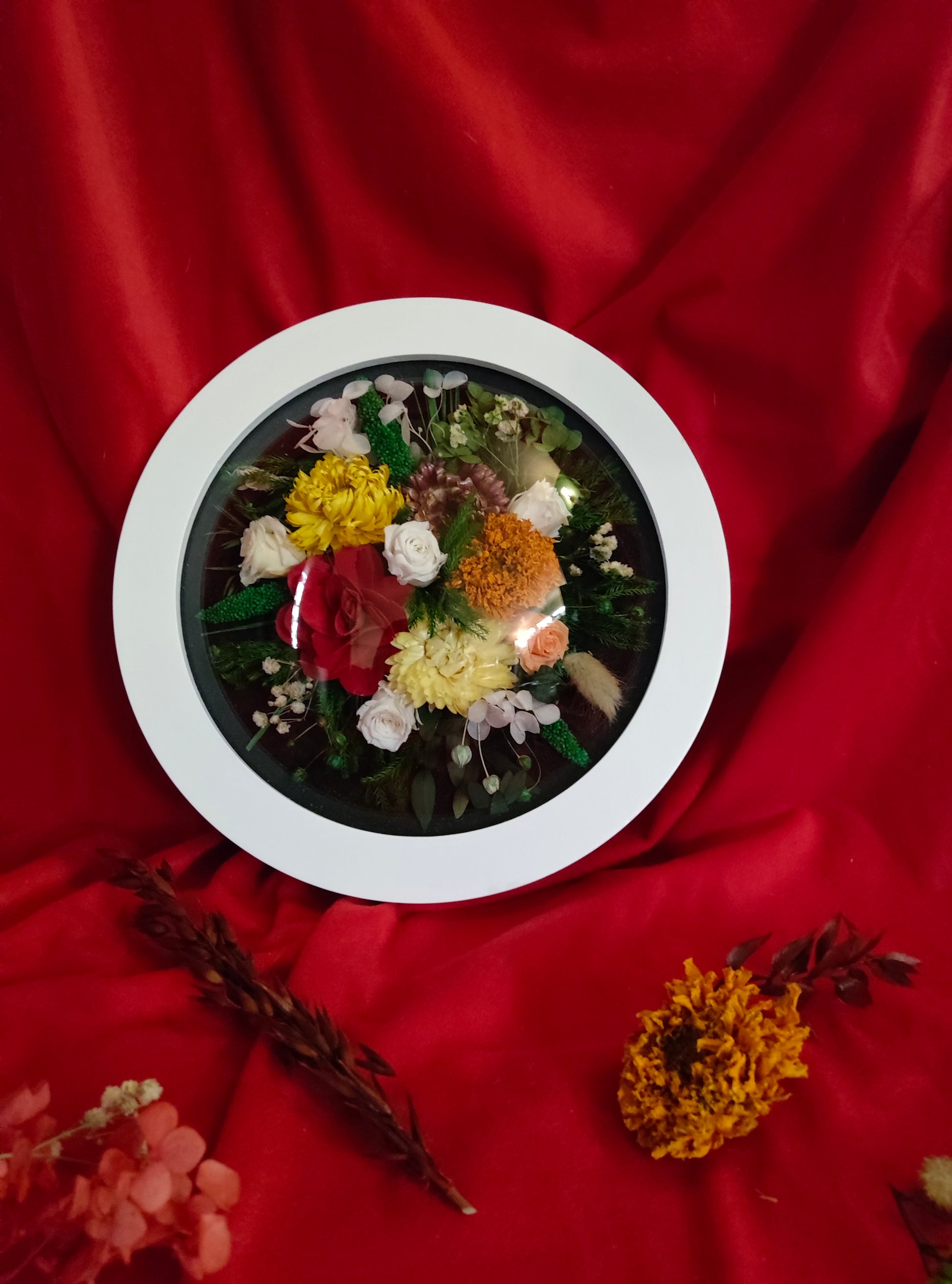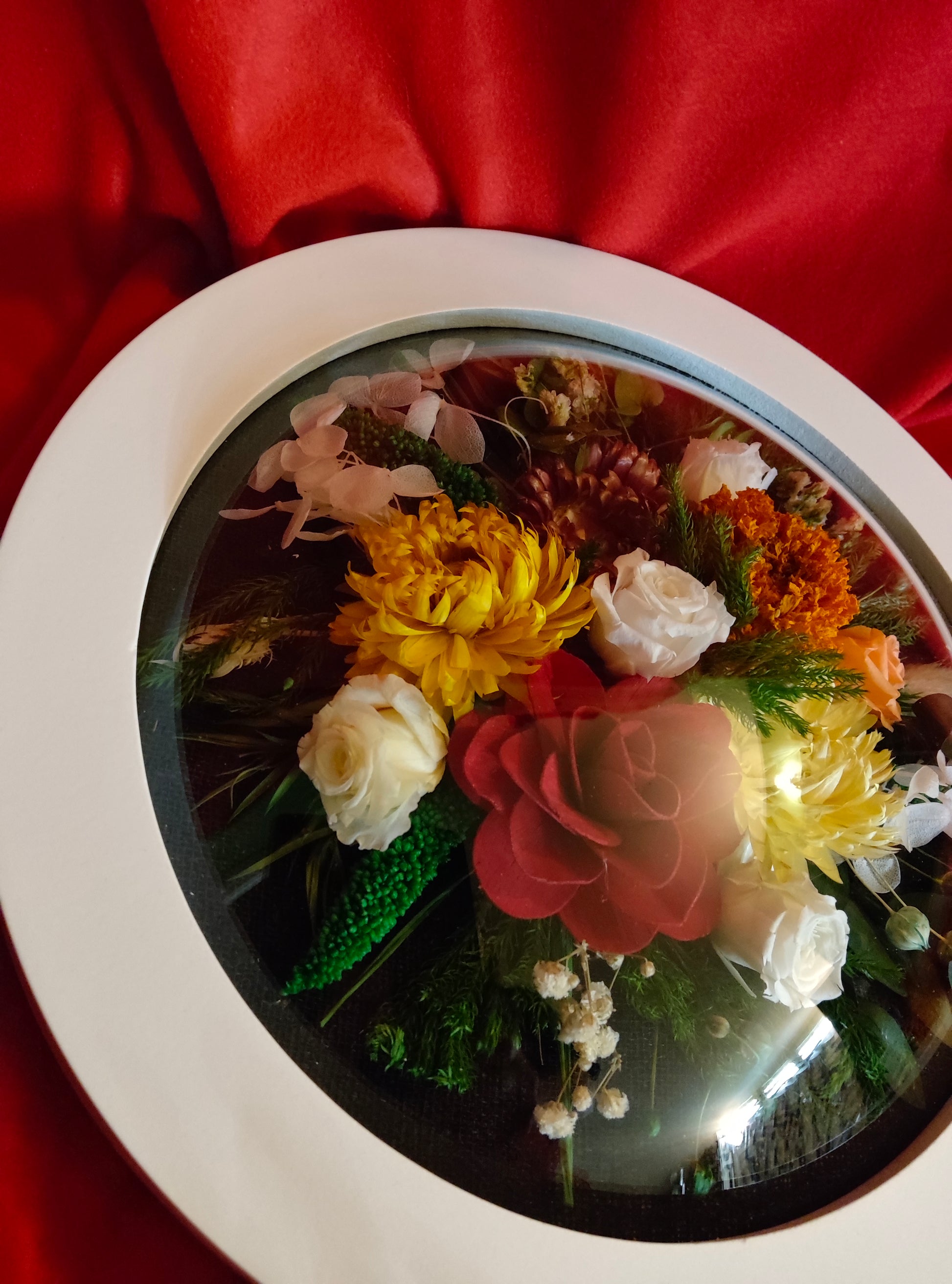 Rama din lemn, sticla acrilica bombata, flori naturale conservate sau uscate.