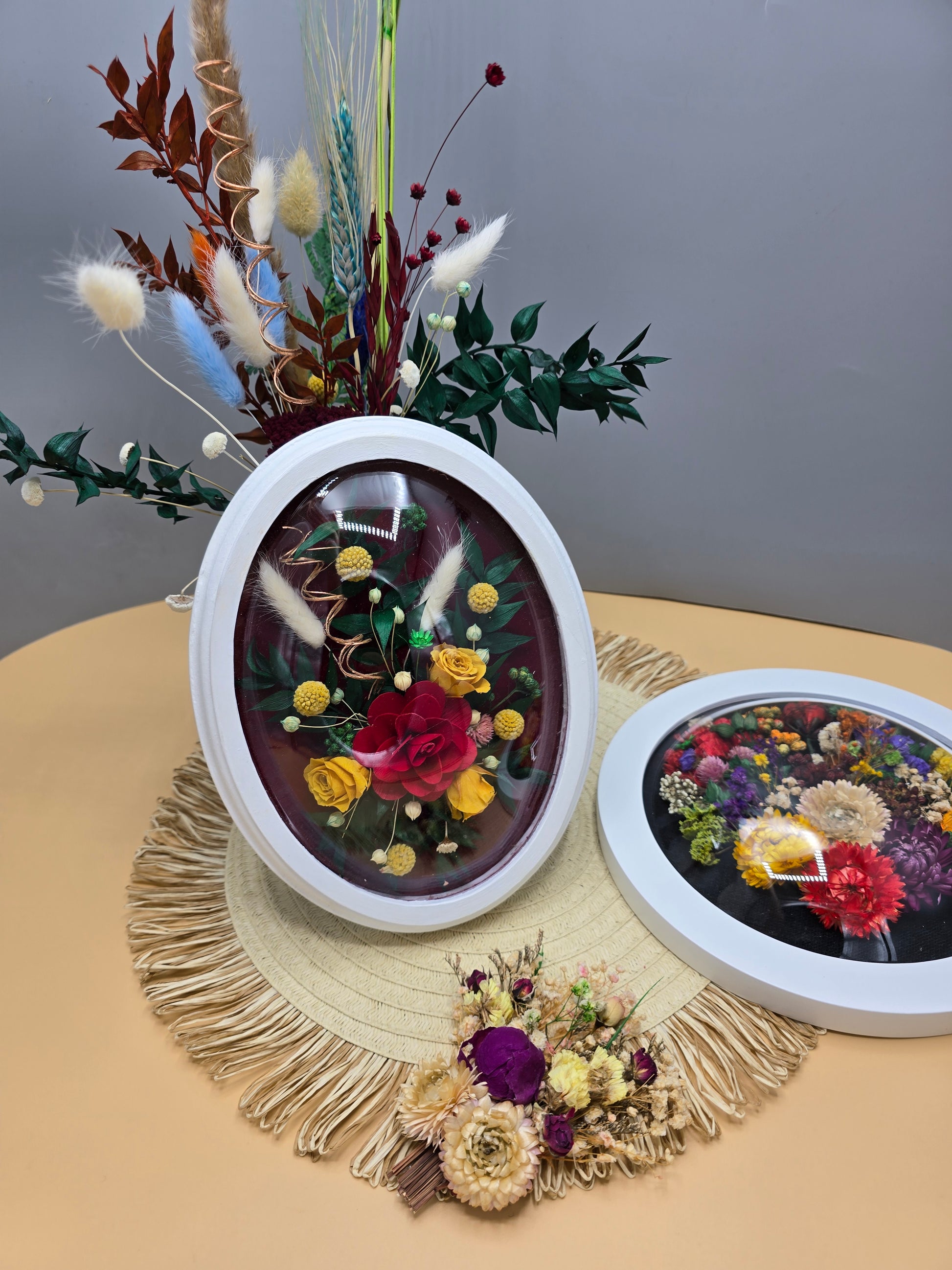 Rama din lemn, sticla acrilica bombata, flori naturale conservate sau uscate.